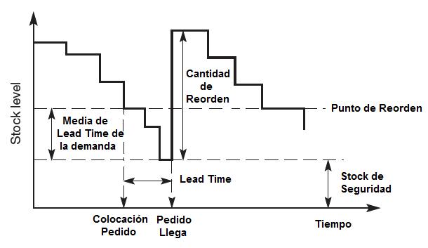 Bajo este enfoque, el nivel de punto de pedido o de reorden, está predeterminado en base a la duración prevista o el tiempo de reaprovisionamiento (ver Figura).