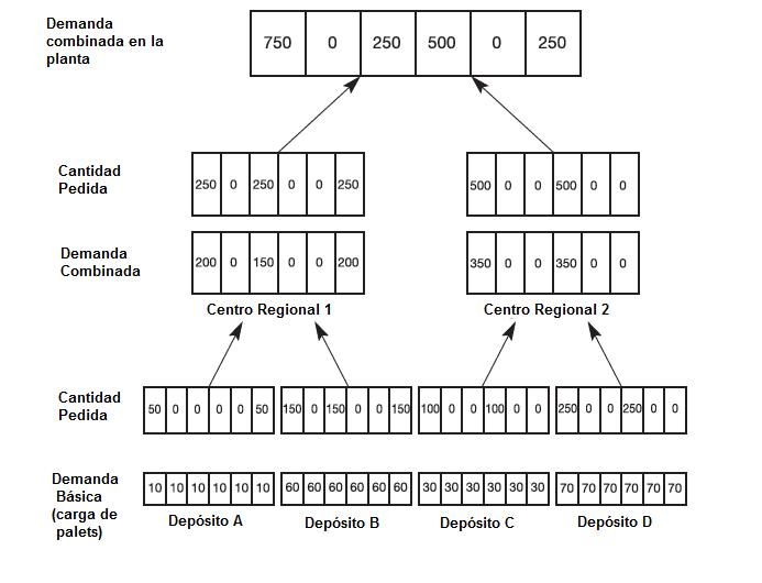 Una situación similar puede producirse en un sistema de distribución multi-nivel en el que se agrega la cantidad total de cada nivel en el siguiente nivel en el sistema. La Figura demuestra lo fácil que es que esto ocurra. La característica común de estos ejemplos es que la demanda en cada nivel en el sistema logístico es dependiente de la demanda en el siguiente nivel en el sistema. La demanda se denomina «dependiente» cuando está directamente relacionada, o deriva de la demanda de otro artículo de inventario o producto.