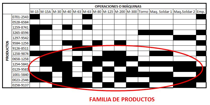 Si disponemos de una amplia variedad de productos, es más que probable que sea complicado seleccionar cual puede ser la familia ideal con la que empezar a trabajar. Para estos casos, es muy útil, seleccionar la familia de productos atendiendo al máximo conjunto de categorías que sean comunes en cada producto. Es decir, para hacerlo fácil, podemos crear una matriz, en la que podamos situar por ejemplo, los pasos de ensamblado, o fabricación y el tipo de equipos en un eje, y los productos en el otro. Con este procedimiento tendremos la oportunidad de ver gráficamente, cuales son aquellos pasos y equipos del proceso que tienen mayor repetición durante la fabricación. En el siguiente ejemplo la concentración de máquinas, operaciones o equipos comunes, diseñan nuestra familia de productos.